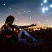 SummoningElla against the backdrop of a city, in the reeds, with stars