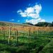 Wine country, with green grass and a blue sky with clouds and a row of grapevines along a hillside